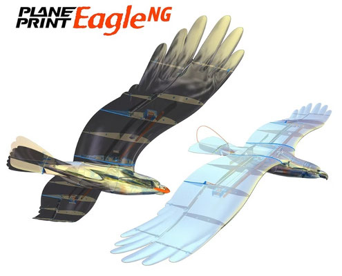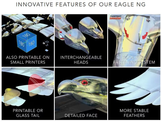 Der PLANEPRINT Eagle NG lässt sich sehr einfach montieren und benötigt lediglich ein einziges Carbonrohr. Realistisch bemalt, ähnelt er einem echten Vogel. Details wie das Gesicht sind nun deutlich präziser gestaltet, was zu einem lebendigen und realistischen Finish beiträgt.
